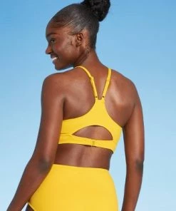 Add a bright, sunny look to your swimwear collection with this ribbed twist-front bralette bikini top. This piece offers comfy wear in a soft recycled polyester fabric with a touch of spandex and full opaque lining that provides coverage in and out of the water. This swim top’s UPF 50+ rated material helps block the sun’s harsh UV rays, and the removable cups offer customizable coverage.