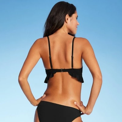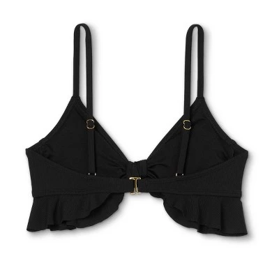 - Black ribbed bralette bikini top with ruffled frills and a tie-front detail