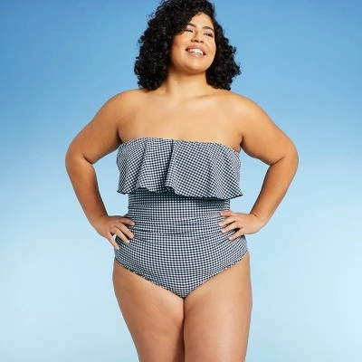 Create an easy, flattering look wearing this Bandeau Flounce High-Coverage One-Piece Swimsuit from Kona Sol™. Covered with a navy-and-white gingham pattern, this bandeau swimsuit features a flounce design that runs from front to back for stylish appeal. Made with soft and stretchy fabric, this high-coverage swimsuit offers flexible movement for comfy diving, playing in the sand or indulging in other fun activities. Add your choice of sunglasses and slide sandals to complete your summer beach-ready look.