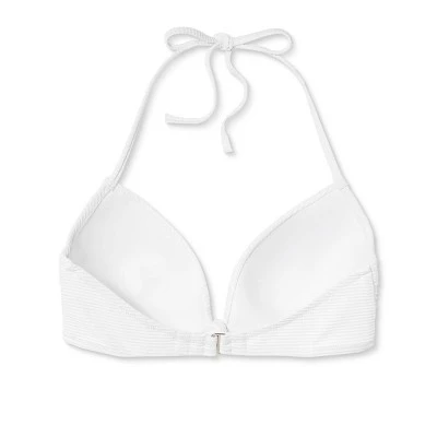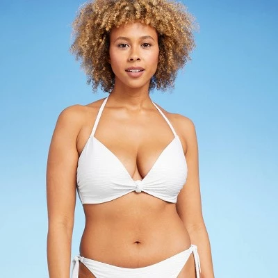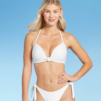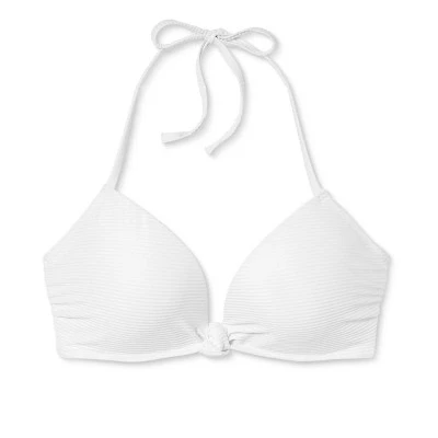 Add a simple twist to your beach-ready routine wearing this Light Lift Knot-Front Foil Ribbed Bikini Top from Shade & Shore™. Featuring a knot front, this white bikini top comes with an halter neck design for a chic, stylish look. It is made with soft fabric with added spandex for stretchy comfort and comes with an underwire for the right support and confident wear. Simply pair this white bikini top with a ribbed bikini bottom with knotted sides to head out to the beach or pool in sweet, coordinated style.