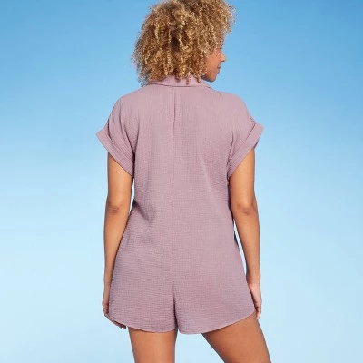 Walk down the beach or poolside in style after a dive wearing this Short Sleeve Button-Up Cover Up Romper from Shade & Shore™. This swim cover-up romper is designed with front buttons and collared neckline for an easy-going style that helps you change the look in an instant. Crafted from 100% cotton for cool comfort, this short-sleeve cover-up romper comes in a relaxed silhouette to add chic flair to your after-swim looks.