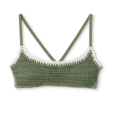 Keep your swimwear collection on-trend with the must-have look of this Crochet Bralette Bikini Top from Xhilaration™. It features a crochet texture for a sweet look, and sports a sage green color with white along the neckline. It’s perfect for pairing with brighter pieces or the matching bottoms for a complete, coordinated look. The back and neck ties meet in a crisscross for a cool, adjustable design, and you can further alter the fit to your liking with the removable cups. An opaque fabric construction offers you the confidence you need for a fun day relaxing on the beach or taking a dip in the pool.