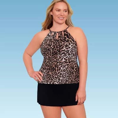 Sophisticated and sleek, this Slimming High Neck Keyhole Tankini from Dreamsuit will be your new go-to. The high neck silhouette is an updated classic, with adjustable neckline shirring and keyholes for added style. Miracle Brands’ favorite drapey fabric skims your shape, while non-removable foam cups and adjustable straps keep you supported. Pair with your favorite Dreamsuit high waist bottoms and strut your stuff on the beach!