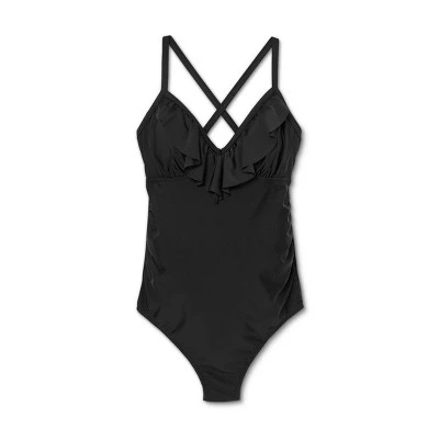 Give your swimwear closet the perfect finishing touch with this Flounce V-Neck One-Piece Maternity Swimsuit from Isabel Maternity by Ingrid & Isabel™. Made from a lightweight fabric with added spandex for a comfy fit, this full-coverage swimsuit showcases a crisscross strap design and charming ruffle detailing along the front. Plus, ruched sides accommodate your growing baby bump for a flattering fit. This one-piece swimsuit is fitted with sewn-in cups to provide shaping and support, and has a back tie strap for an adjustable fit, making this flattering suit equal parts stylish and functional.
