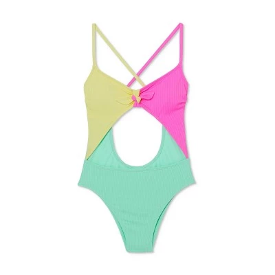 Add this Ribbed Colorblock Tie-Front One-Piece Swimsuit from Xhilaration™ to your swimwear collection for those days when you want to stand out from the crowd. The cheeky high-leg swimsuit is styled with an open front and back for a daring look, and the stretchy lightweight fabric and removable-cup construction add comfort. Plus, the colorblock fabric adds fun visual interest and the ribbed fabric adds a pop of texture. This tie-front one-piece swimsuit will turn your beach style up a notch, and can easily be paired with a swim cover-up or skirt for poolside lounging.