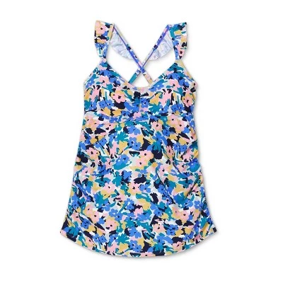 Give your swim look a charming update with this Scoop Neck Ruffle Strap Maternity Tankini Top from Isabel Maternity by Ingrid & Isabel™. The tankini style provides full torso coverage, while a scoop neckline gives it a more interesting silhouette for added style. Sewn-in cups help to keep you covered at the bust, and adjustable straps that cross in back and ruched sides to accommodate your growing baby bump make it a piece you’ll feel great in with every wear. A ruffle along the straps add a sweet touch of movement that’s perfectly complemented by the vibrant floral print, making it a swimwear piece you’ll love to show off.
