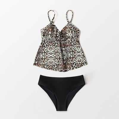 Our tie front cutout tankini set is perfect for your next vacation. Features ruffled detailing and mid waisted black bottom. The self tie design makes the item fits every body type.Product Code: ASF9078EB