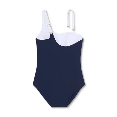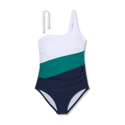 You’ll love the fun twist a classic one-piece gets in the Colorblock One-Shoulder High Coverage One-Piece Swimsuit from Kona Sol™. This one-piece swimsuit has a high coverage design that provides full torso and seat coverage, while removable cups let you choose how much coverage you prefer at the bust. A one-shoulder silhouette balances out the modest cut with playfully chic style, and shirring at the sides helps to create a flattering silhouette. The whole piece pops with three horizontal colorblocks — one in white, one in dark teal and one navy — for a can’t-miss look. A removable strap is included to give you a second asymmetrical way to style the swimsuit.