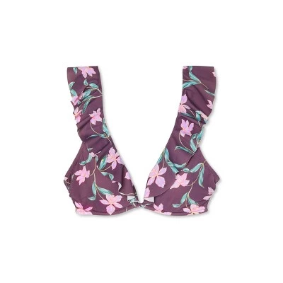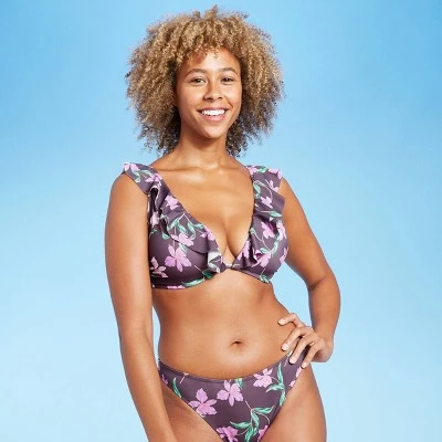 Embrace the summer in sweet style with the Dusk Floral Lightly Lined Ruffle Front Bikini Top from Shade & Shore™. Adorned with bright florals that pop against a purple background for a standout look, this floral bikini top has soft ruffle trim that decorates the neckline to elevate your style. Plus, the molded cups and lightly lined fabric offer the perfect shape and support, leaving you with a confident fit. Pair with matching bikini bottoms or mix with solid bottoms for a dynamic flair.