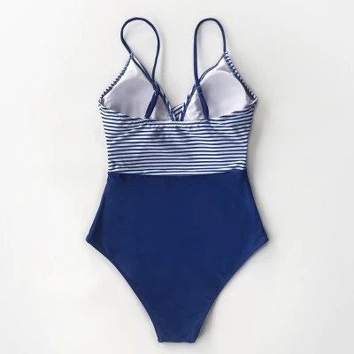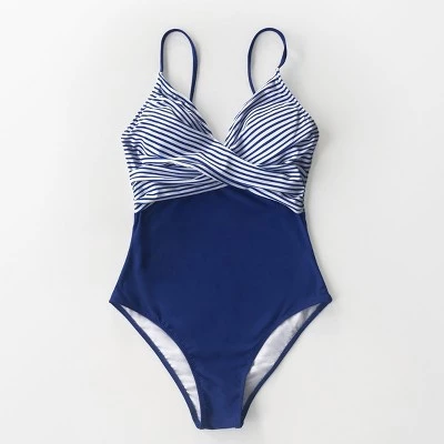 A classic natutical-inspired maillot, the blue and stripe one piece swimsuit will never go out of style. Detailed with a v-neck and padded cups, it’s design to fit and flatter your curves so you can catch waves with confidence.Product Code: AB11189M
