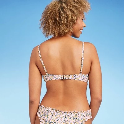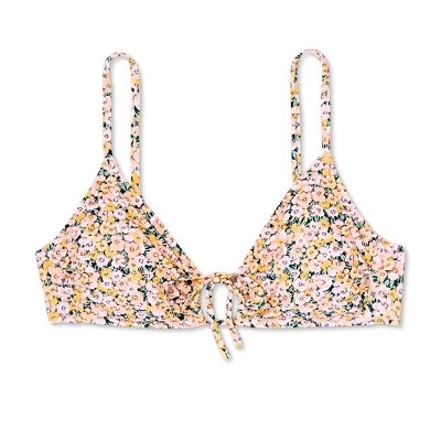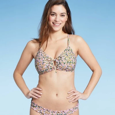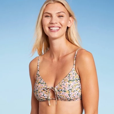 Add floral charm to your poolside look with this Yellow Floral Keyhole Bralette Bikini Top from Shade & Shore™. This floral print bralette bikini top makes a charming pick in your swimwear. Made from stretch material for flexible comfort, it features a front keyhole, along with tie detail for a chic look. The adjustable shoulder straps and a hook back closure ensure a worry-free fit, while the removable cups make it easy to customize your look to suit your style. Pair with a matching floral print bikini bottom or a solid-color bikini bottom for an endless array of styling options.