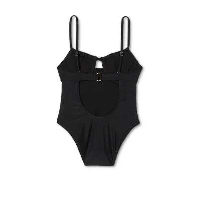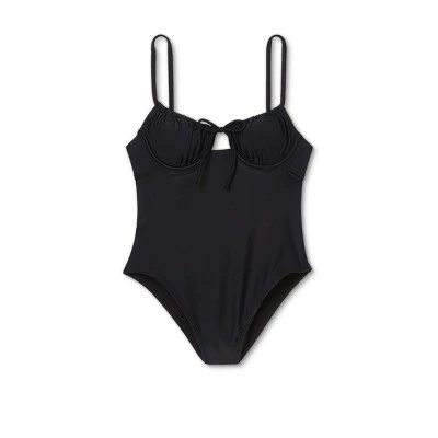 Take a lap around the pool or soak up some sun wearing the Shirred Underwire One-Piece Swimsuit from Xhilaration⢠. In solid black, this sleeveless swimsuit adds an elegant addition to your swimwear collection and is made of a soft and stretchy material for easy movement with a flexible fit. You’ll love the sweetheart neckline on the front with string ties and a keyhole cutout, underwire design with shirring accents that offers enhanced support and shaping, as well as the removable soft cups that let you customize your look to suit your mood and style. The slender shoulder straps are adjustable to let you find your perfect fit for secure wear, and they lead into a scoop back featuring a back band with hook-and-loop closure for a stay-put fit.