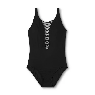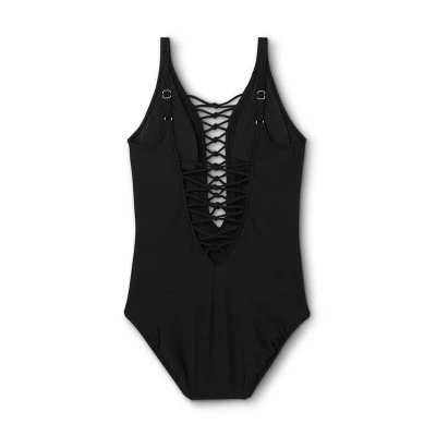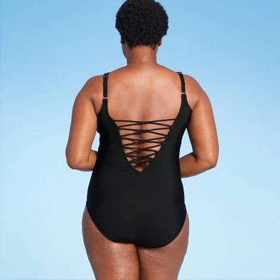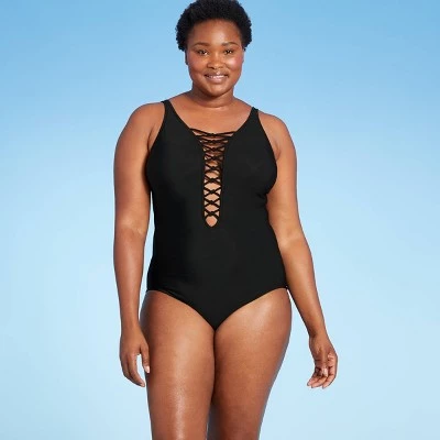 This Aqua Green one piece offers the perfect balance between simple and alluring, with a dramatic front and back plunge. Adorned with intricate knot and strappy detailing, this swimsuit can be paired with a flowy cover up or shorts for the perfect vacation look. In classic black, this is truly a stand-out and versatile piece.