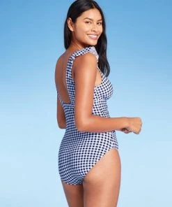 The Ruffle Gingham High Coverage One-Piece Swimsuit from Kona Sol™ is a great piece to add some classically sweet style to your swimwear. This one-piece swimsuit has a high coverage design that provides full torso and seat coverage. A deep V-neckline let you show just the right amount of skin, while sewn-in cups balance out the deep neckline and provide bust coverage. A classic blue and white gingham pattern gives the swimsuit a sweet look that you can take from the water to the day’s next outing just by slipping on a pair of palazzo pants, and ruffles at the shoulder add just a touch of movement.