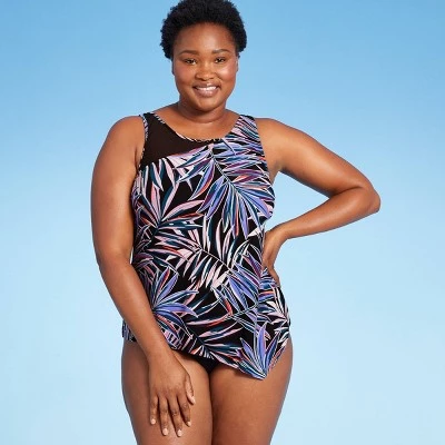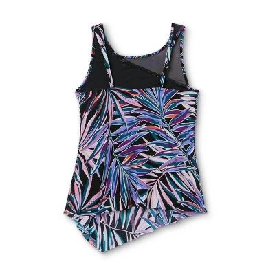 Create a confident waterside look with this refreshing beach-ready tankini top with a fresh take of a colorful tropical print. This deep blue top with a colorful print has an asymmetrical handkerchief hemline which will elongate your figure and adds curves where needed. The high neckline has an asymmetrical mesh inset in addition to removable cups and adjustable straps for ultimate comfort while style while being the most stylish person on the beach.