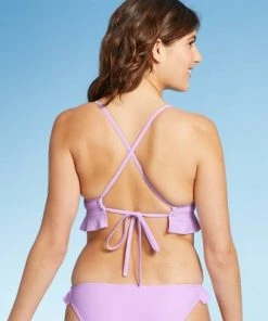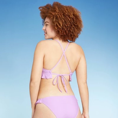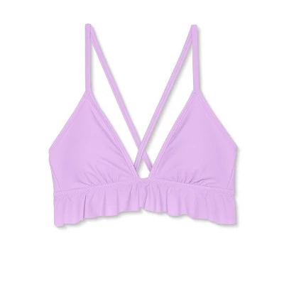 Soak up the sun in playful style in this Ruffle Triangle Bikini Top from Xhilaration™. The stretchy fabric allows for comfy movement and it’s designed with removable cups for customizable coverage. Plus, it features back ties to offer you a secure and personalized fit. Showcasing a playful triangle cut in a lavender hue with ruffles below the bust line and accented by a crisscross back, this solid bikini top is sure to bring the right amount of sassy style to your swimwear.