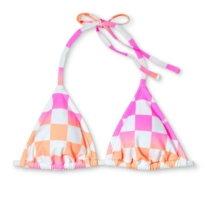 Update your swimwear with the fashion-forward look of this String Bikini Top from Xhilaration™. A white backdrop is printed with an allover checkered print in a gorgeous pink-and-orange ombre style you’ll love showing off in the sun. It has ties around the back and neck, letting you adjust this top to be as snug as you need to feel comfortable. Removable pads and an opaque fabric construction will have you basking in the sun or strolling along the shore feeling your most confident.
