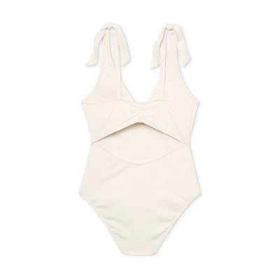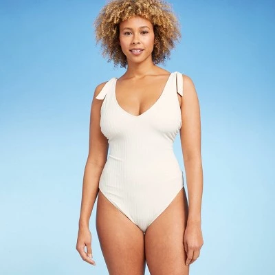 - Shoulder-tie ribbed one-piece swimsuit makes a flattering swimwear option