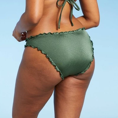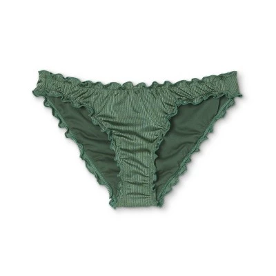 Add fashionable frills to your swim wardrobe with this Moss Green Ribbed Ruffle Cheeky Bikini Bottom from Xhilaration™ . This cheeky bikini bottom in a solid moss green color makes a versatile addition to your collection of swimwear separates. Featuring an on-trend low-rise cut, it boasts a vertical ribbed texture fabric along with ruffle accents on the trim to add unique style. The soft, stretch fabric with elastic at the leg openings ensures comfortable movement, while the opaque construction offers coverage for confident wear. Pair them with the available matching bikini top to complete your coordinated set, or with other bikini tops for different styling options.