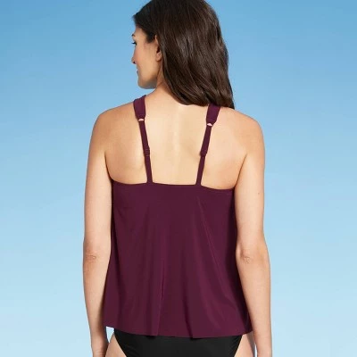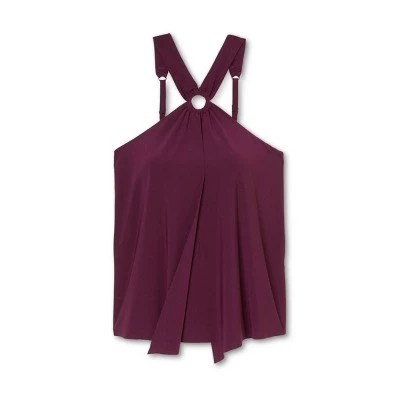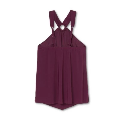 Bring your chic feminine side to the pool in this modern minimalist Aqua Green® tankini top. The crisscross neckline with a ringed detail joins the straps in the front to offer an eye-catching look with an fashion forward flare. The simple yet elegant look has a draped front overlay that can cover any unwanted areas to provide a camouflage effect and accents the waistline.