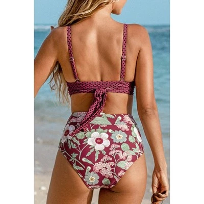 Soak up the sun in our polka dot and floral twist bikini. The polka dot bikini top has moulded cups and tie at the back for added support and adjustable fit. The matching high waisted floral bikini bottom provides flattering tummy coverage for a comfy, no-stress day at the beach!β¨Product Code: ADK8004M