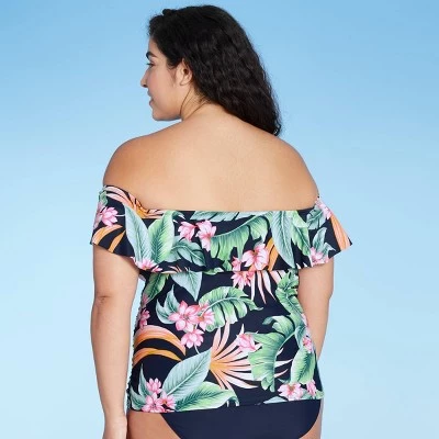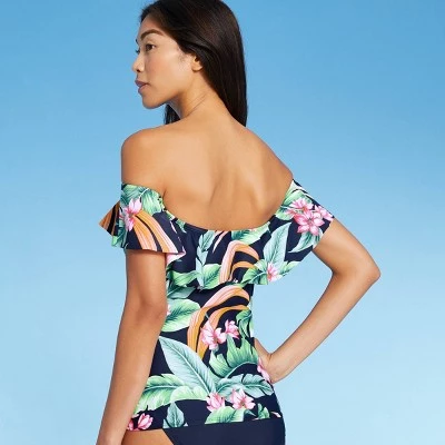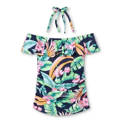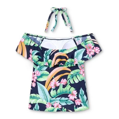 Playful yet chic, the Off-the-Shoulder Tankini Top from Kona Sol™ makes a great alternative to a traditional tankini. A tankini-style swim top gets a flirty spin from an off-the-shoulder silhouette, while still providing full torso coverage. Sewn-in cups provide extra coverage at the bust, and the swim top comes with attachable tie straps that you can use just to change up the look up the top or for a more secure-feeling fit. A ruffle along the neckline adds a sweet touch of movement that’s perfectly complemented by the tropical flower print for a swimwear piece you’ll love to show off.