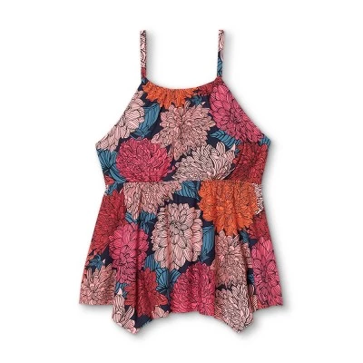 The High-Neck Flow Away Tankini Top from Kona Sol™ adds delightful dahlia flair to your swim look. This tankini top flares down from the cinched bustline and features a bold print of vibrant dahlia flowers and foliage against a navy background for a flowy look with easy-breezy flair. The pullover style boasts a high neckline front paired with slender and adjustable shoulder straps, as well as a sharkbite hemline that creates a beautiful asymmetrical look you’ll love. The printed swim top is made from a soft and stretchy fabric that offers you flexible movement whether you’re swimming, lounging along the shore and more. Wear it with black bikini bottoms or any solid color that complements the flowery tones.