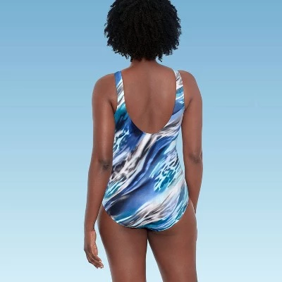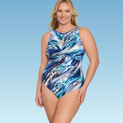 Bring a touch of elegance to the beach in this Slimming Control High Neck One Piece from Dreamsuit. The sophisticated high neckline draws the eye upward, with a keyhole to offer a glimpse of skin. Crossover wrap styling and front shirring work together to flatter your figure, and non-adjustable straps and non-removable foam cups provide the support you love. Miracle Brands exclusive fabric smooths and shapes your silhouette, keeping you confident and comfortable all day long.