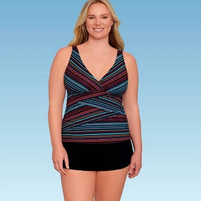 You’re ready for the pool or the party in this Slimming Wrap Look Tankini from Dreamsuit. The V neckline flatters every body type, while strategically placed seaming emphasizes your hourglass figure. Miracle Brands’ favorite drapey fabric skims your silhouette in the most flattering way, with underwire cups and adjustable straps to make sure you’re supported. Pair with your favorite Dreamsuit high waist bottoms and you’re good to go!