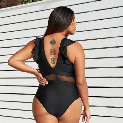 A style you will love. Our ruffle plunge v neck plus size one piece swimsuit is sweet . Features a plunging v-neck design in the front and back with ruffle at the shoulder and mesh detailing at waist.Product Code: APL0003BB