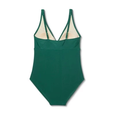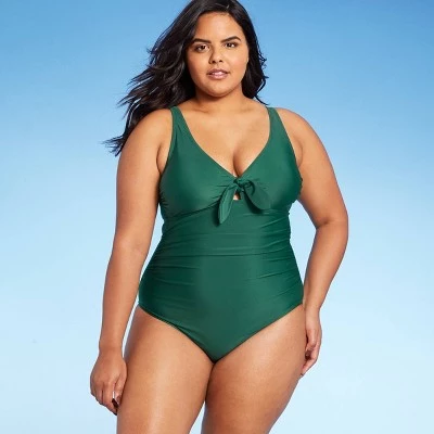 Add classic style to your swimwear collection with the Bunny Tie High-Coverage One-Piece Swimsuit from Kona Sol™. This green one-piece swimsuit provides full front, back and seat coverage for confident wear, with bunny tie detail, keyhole shirring and a V neckline adding some extra dimension and flair. You’ll love the sewn-in cups that offer convenient coverage, and the adjustable straps make it easy to find just the right fit.