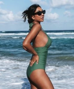 Best Sale 🤩 Women’s One Piece Swimsuit Backless V Neck Halter Green Bathing Suit-Cupshe ⌛