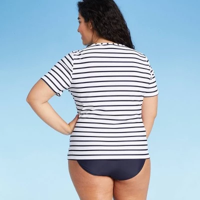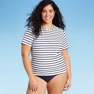 The Short-Sleeve Crew Neck Rash Guard from Kona Solโข makes a great pick for your outdoor activities, whether you’re spending the day in the water or relaxing on it in a boat. This women’s rash guard makes a great high-coverage swimwear option, providing full torso coverage and partial arm coverage along with added protection from the sun’s rays thanks to UPF 50+ rated material โ perfect for keeping you protected during any sunny outing. With navy and white horizontal stripes, the rash guard has a nautical-inspired look that can just as easily pair with a navy swim bottom as a pair of jeans or bermuda shorts to suit your day.