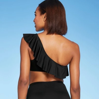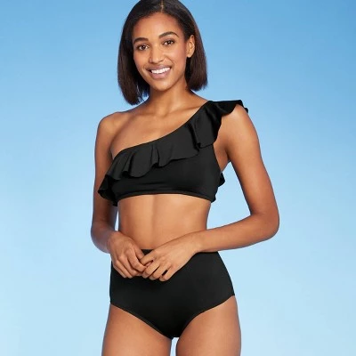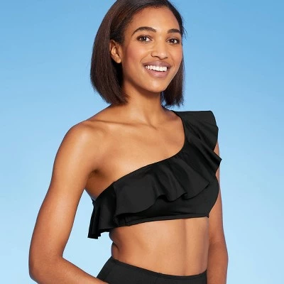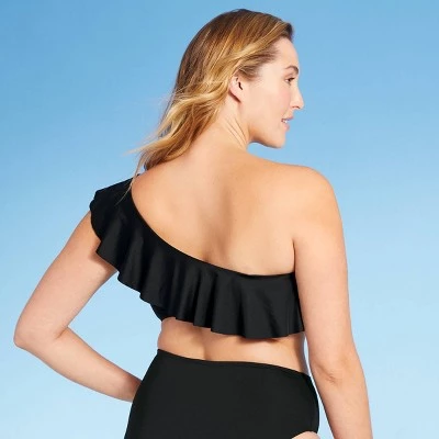 The One-Shoulder Flounce Bikini Top from Kona Solβ’ is full of elements that are sure to make it a fast favorite in your collection of swimwear. A one-shoulder cut gives this bikini top a chic silhouette that’s perfectly balanced out by a ruffle along the neckline for a touch of sweetness. The solid black color keeps the overall look sleek and sophisticated, while also making the piece easy to coordinate with both solid-colored and patterned bottoms. The swim top has a pullover style with an elastic band so you don’t have to worry about fussing with hooks or ties, and removable cups let you choose how much coverage you want at the bust.