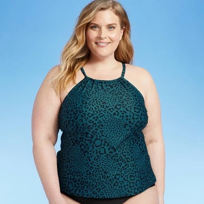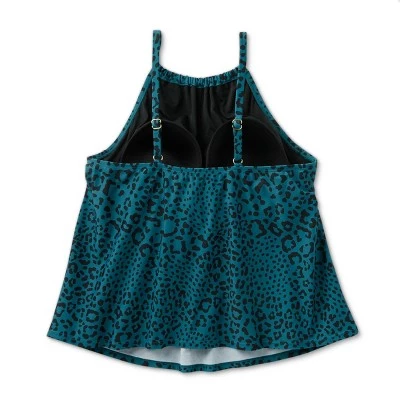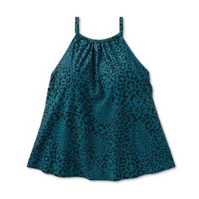 Stay on-trend while enjoying summer days and evenings wearing this High Neck Tankini Top from Kona Solβ’. Showcasing an animal print in a black hue on the teal blue backdrop, this printed tankini top features a high-low hem for enhanced style. The cinched high neck accompanies the adjustable double straps to help you find the perfect fit. Tailored with a mix of soft and stretchy fabric for flexible comfort, this sleeveless top makes a beautiful choice for layering over both solid-hue and animal-print bottoms.
