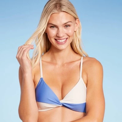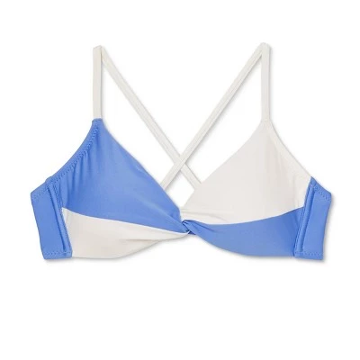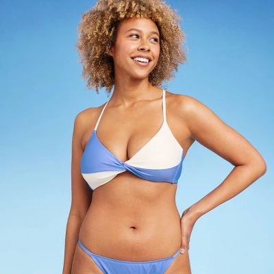 Keep your swim look chic and contemporary with this Periwinkle & Cream Colorblock Twist-Front Bralette Bikini Top from Shade & Shore™. This lavender blue and cream colorblock bralette bikini top makes an on-trend pick in your swimwear. Made from stretch fabric for comfy movement, it features a twist front design for added style. The breezy crisscross back with adjustable tie straps helps you find the right fit, while the removable cups offer the customized coverage you desire. Pair with a matching colorblock bikini bottom or a solid-color bikini bottom for an endless array of styling options.