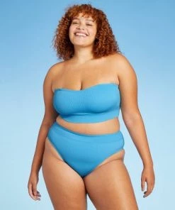 Best Pirce 🧨 Juniors’ Plus Size Ribbed High Waist Bikini Bottom – Xhilaration™ Blue ⌛