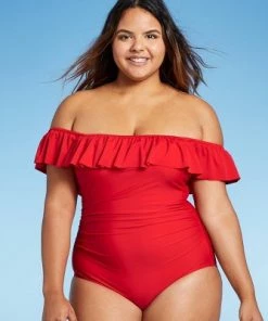 Outlet 🎁 Women’s Off the Shoulder High Coverage One Piece Swimsuit – Kona Sol™ Red 🎉