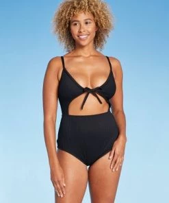 Wholesale 😍 Women’s Ribbed Tunnel Tie-Front Cut Out One Piece Swimsuit – Shade & Shore™ Black ✨