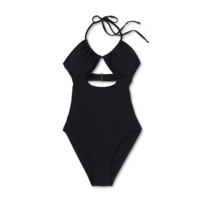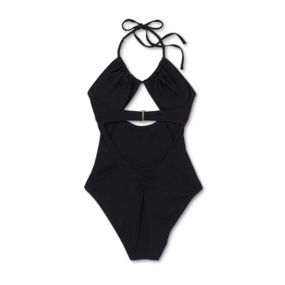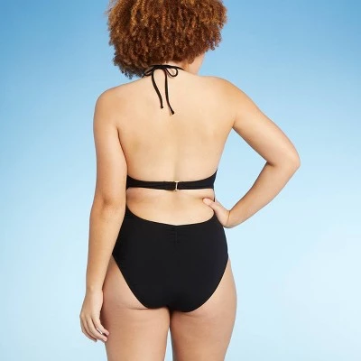 This Ribbed Tunneled U-Neck One Piece from Xhilaration⢠will make a statement whether you’re in the pool or running along the shore. Its halter and U-neckline sit atop a cutaway on the abdomen for an on-trend look, while the adjustable back closure gives the confidence of a secure fit. The solid-colored stretchy, lightweight fabric is lined for comfort in and out of the water. With a scoop back and high leg cut, this flattering one-piece swimsuit is a terrific addition to your swimwear collection.