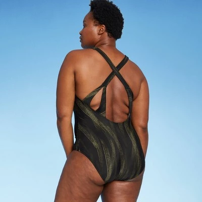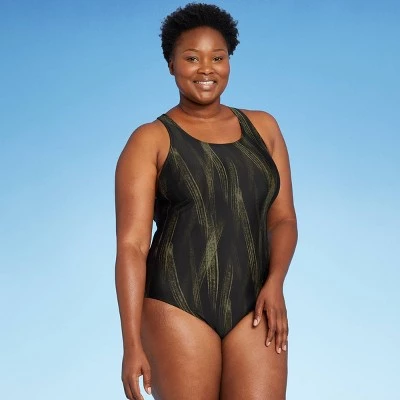 A one-piece design with a high neck lets you feel comfortable and confident on all of your beach days. The open back, crisscross straps and faded black-and-olive pattern add a sporty flair. Stretchy fabric and sewn-in cups allow freedom of movement and secure coverage, while a UPF 50+ rating helps you beat the heat whether you’re swimming in the ocean or playing a game of volleyball. Plus sizing features adjustable back straps, flattering back details and sewn-in cups.