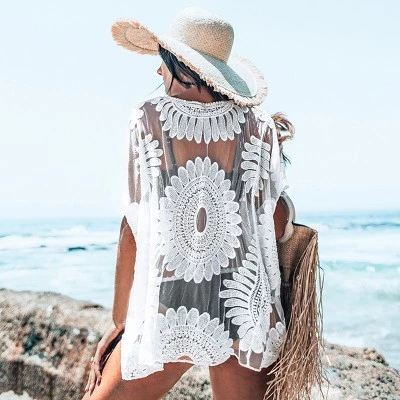 Throw on the White Sun Flower Mesh Short Sleeve Cover Up over your bikini and hit the beach bar! White lace shapes this sheer swim cover-up with short sleeve. The sun flower pattern is also a must-have in your beach trip.
