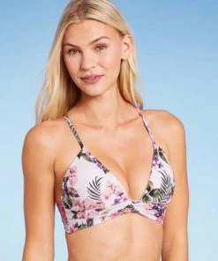 Budget 💯 Women’s Lightly Lined Twist-Front Plunge Bikini Top – Shade & Shore™ White Tropical Print 🧨