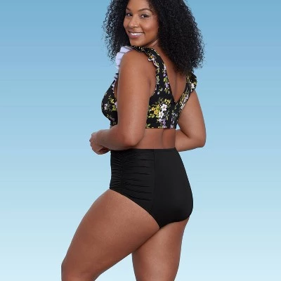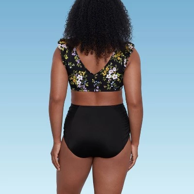 You just might ruffle some feathers in Beach Betty’s Slimming Control Ruffle Bikini Top. Classic black complements the delicate floral print, with blossoms cascading in purple, pink, yellow, and green. A flirty ruffle cap sleeve offers a little extra protection from the sun, while the V neckline flatters your figure. Removable foam cups provide extra support, with Miracle Brands’ exclusive shaping fabric keeping you comfortable and confident all day long. Pair with your favorite Beach Betty bottoms and strut your stuff!