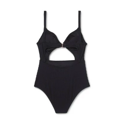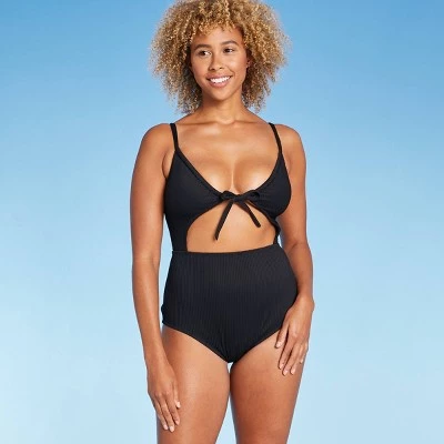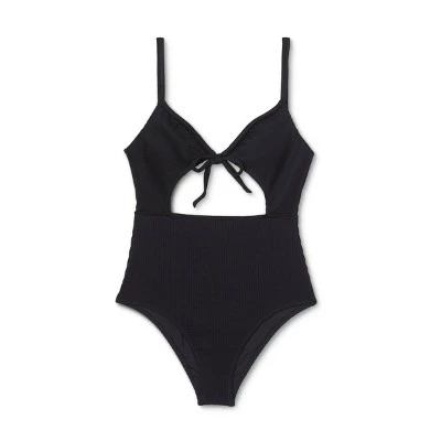 Earn some sensuous style points with the Ribbed Tunnel Tie-Front Cut-Out One-Piece Swimsuit from Shade & Shore™. Made from a soft and stretchy fabric, this one-piece swimsuit is fashioned in a solid black hue, adorned with allover ribbing for a fun textural look. The pull-on swimsuit is designed with slender shoulder straps and a plunging sweetheart neckline with tunnel ties to control the cinched look, as well as a cut-out detail beneath the ties to add a peek-a-boo vibe. The back strap with a hook closure helps keep it in place for confident wear in and out of the water. Complete your look with a kaftan cover-up, oversized sunnies and espadrille sandals.